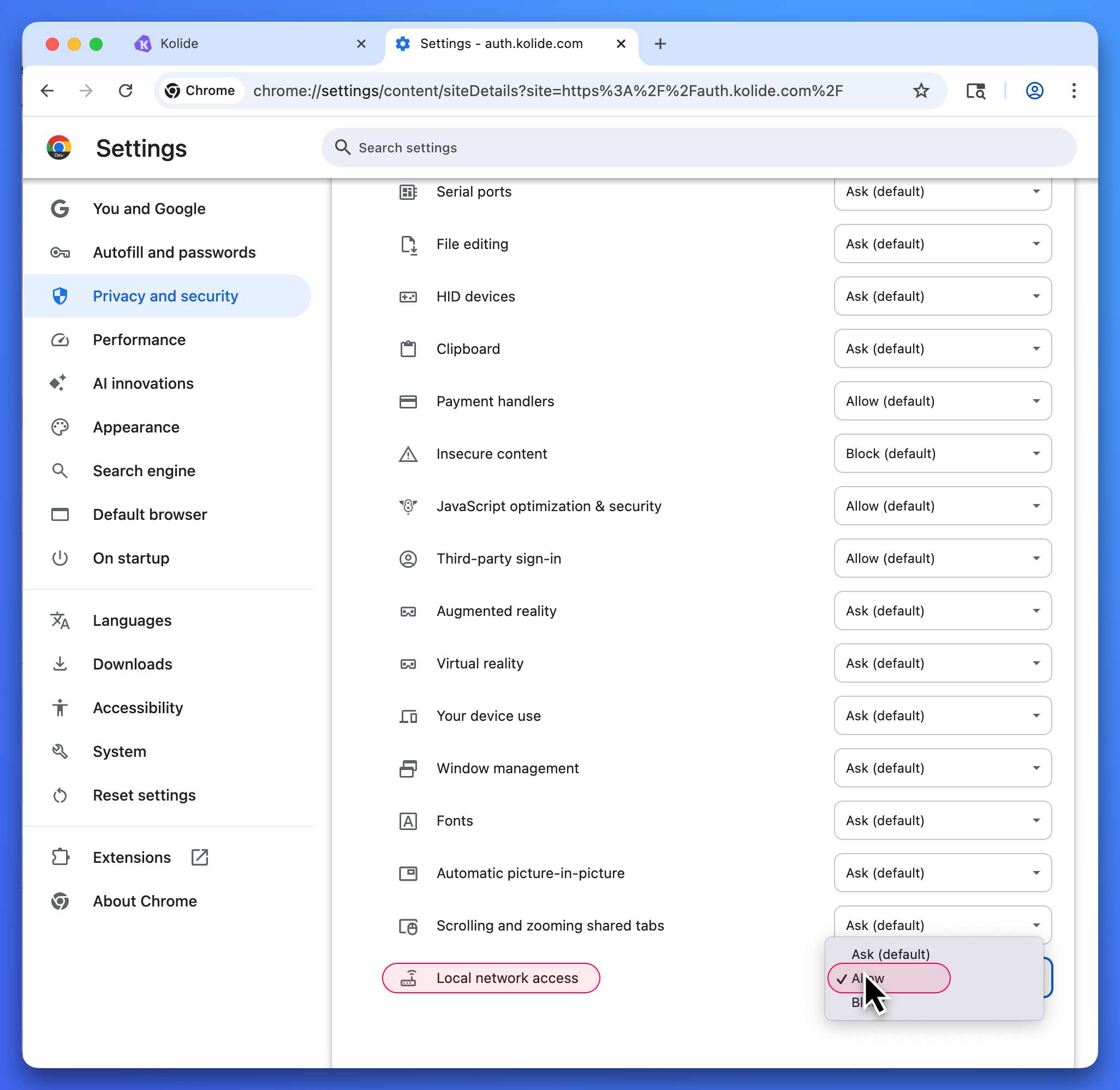 - Select the dropdown to the right of Local network access, then choose Allow from the list.