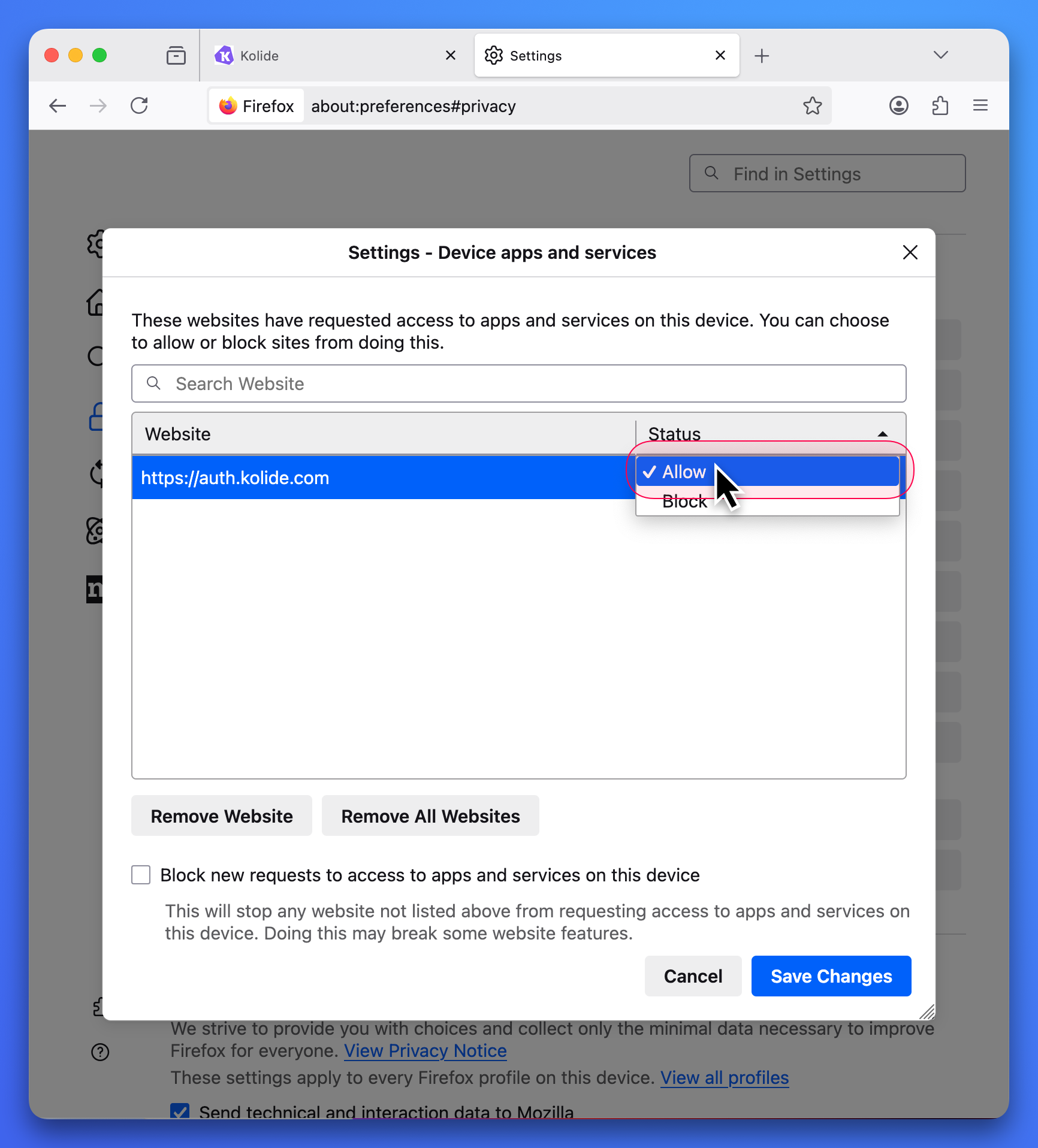 to Allow, select the Save Changes button at the bottom-right of the modal.